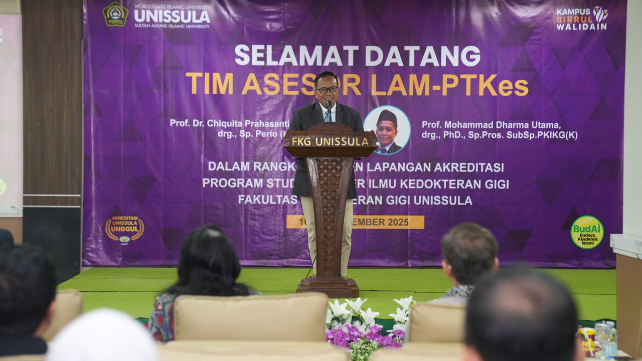 Magister Ilmu Kedokteran Gigi (MIKG) FKG Unissula menyelenggarakan asesmen lapangan reakreditasi, Senin (17/11/2025). Hadir tim asesor LAM-PTKes Prof Dr Chiquita Prahasanti drg Sp Perio (K) guru besar Universitas Airlangga Surabaya dan Prof Mohammad Dharma Utama drg PhD Sp Pros SubSp PKIKG (K) guru besar Universitas Hasanudin Makassar.